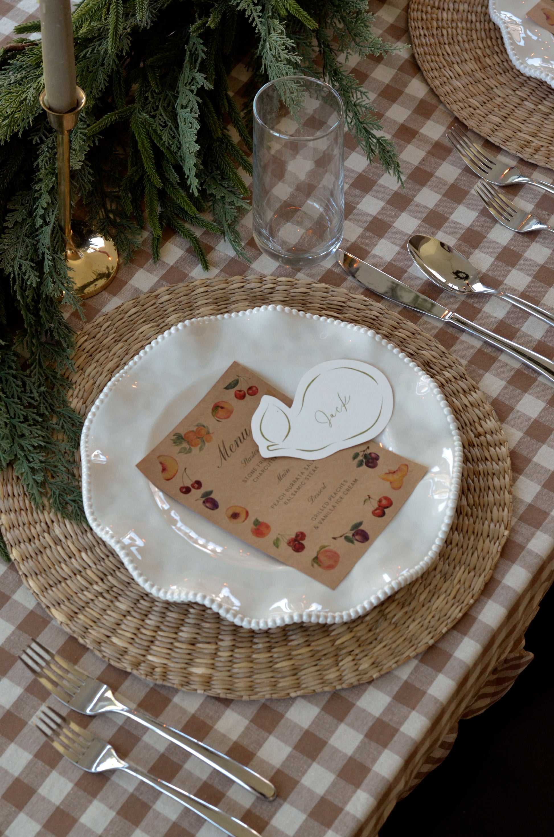Bring a touch of the European countryside to your table with our Brown Ruffle Gingham Tablecloth. Inspired by the warmth of rustic french kitchens and the charm of English country manors, this tablecloth combines a timeless pattern with romantic details. The classic chestnut-ivory gingham is tailored from 100% cotton and finished with a gathered ruffle edge that drapes beautifully for a refined yet lived-in feel. Perfect for autumn dinners, harvest feasts, or a neutral everyday table linen.