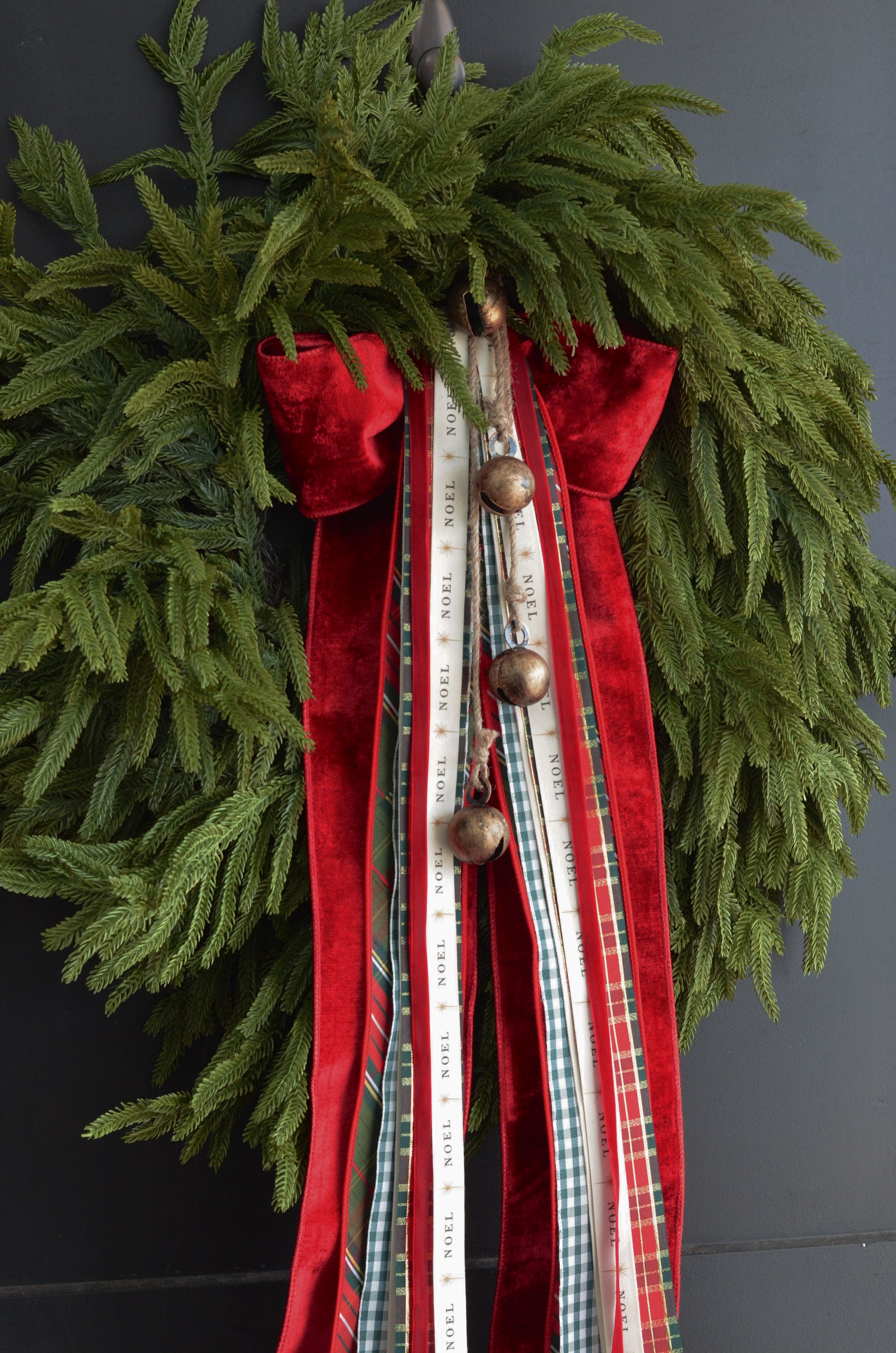 Add a timeless touch of Christmas charm to your holiday decor with our luxe Christmastide Bow. Crafted with rich, red velvet and layered with cascading ribbons in festive plaid and "Noel" script accents, this bow captures the magic of the season in one elegant piece. Perfect for wreaths, garlands, or banisters, it instantly elevates your holiday decorating with its mix of classic patterns and luxe textures. Bells sold separately. 27" long, clip included. Styled with our rustic hanging jingle bells. Dimensions: 27" Long