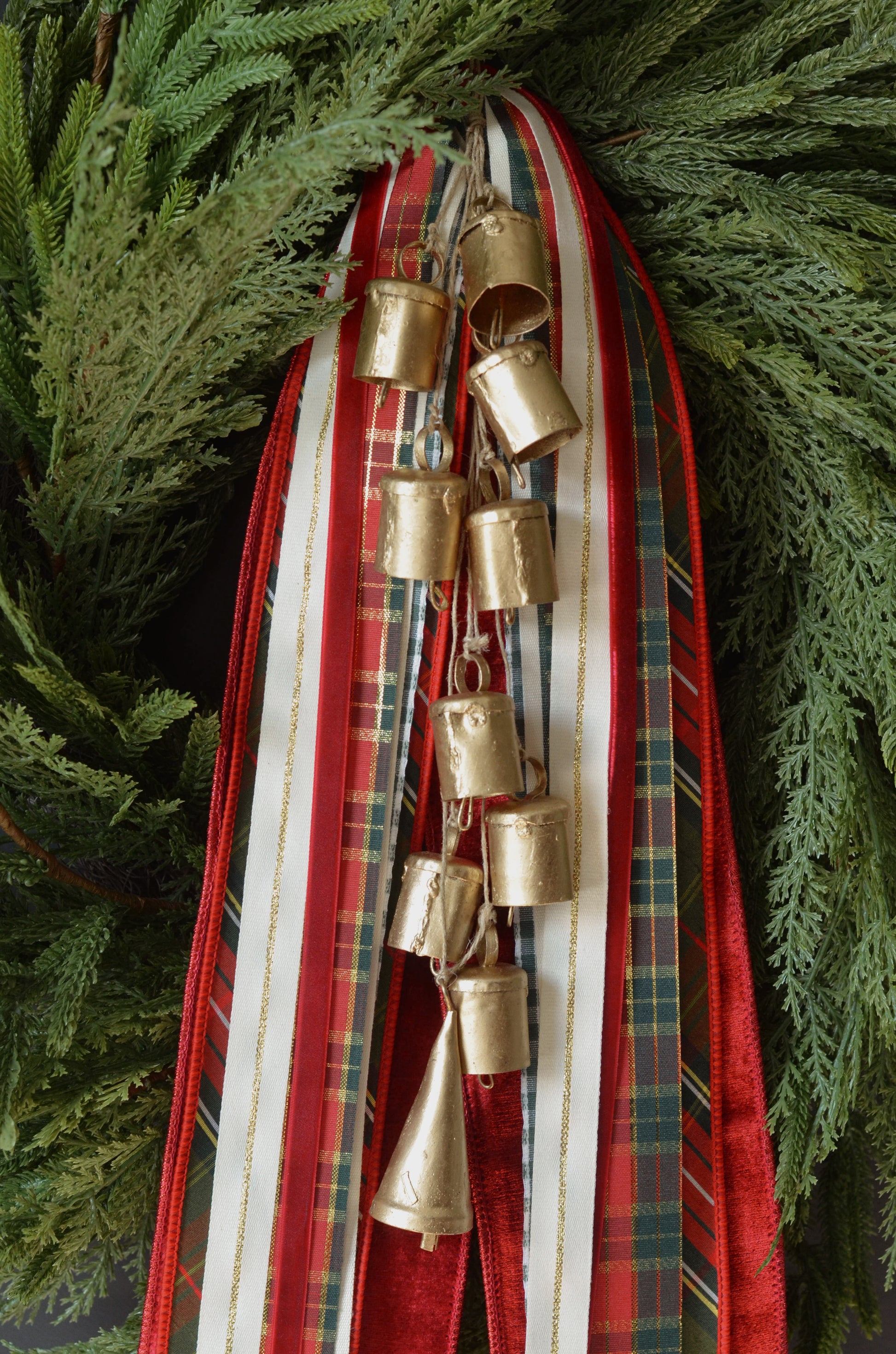 Elevate your holiday décor with this charming gold hanging bell cluster. Perfect for wreaths, mantel displays, or paired with stockings, the gleaming bells add a touch of festive sparkle and a gentle jingling charm. Lightweight and easy to hang, this versatile accent brings timeless elegance and cheerful holiday spirit to any space. Pairs well with our Christmas wreath ribbons.