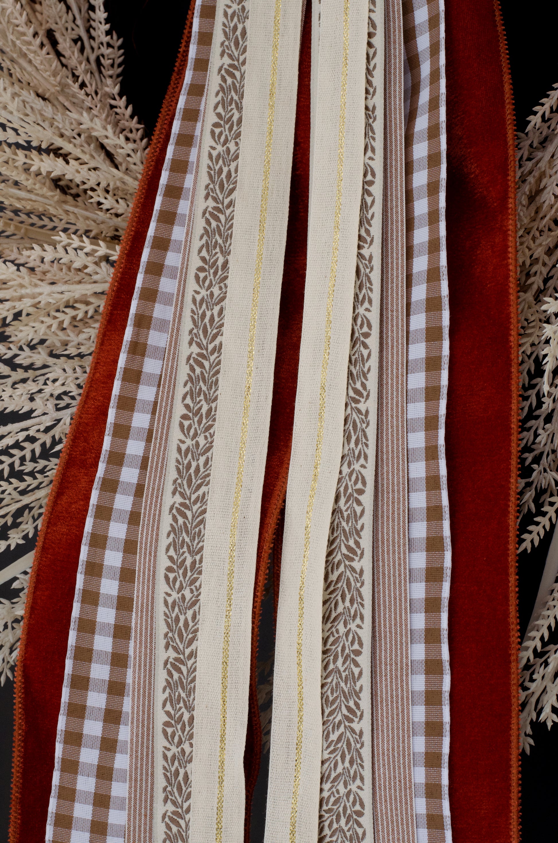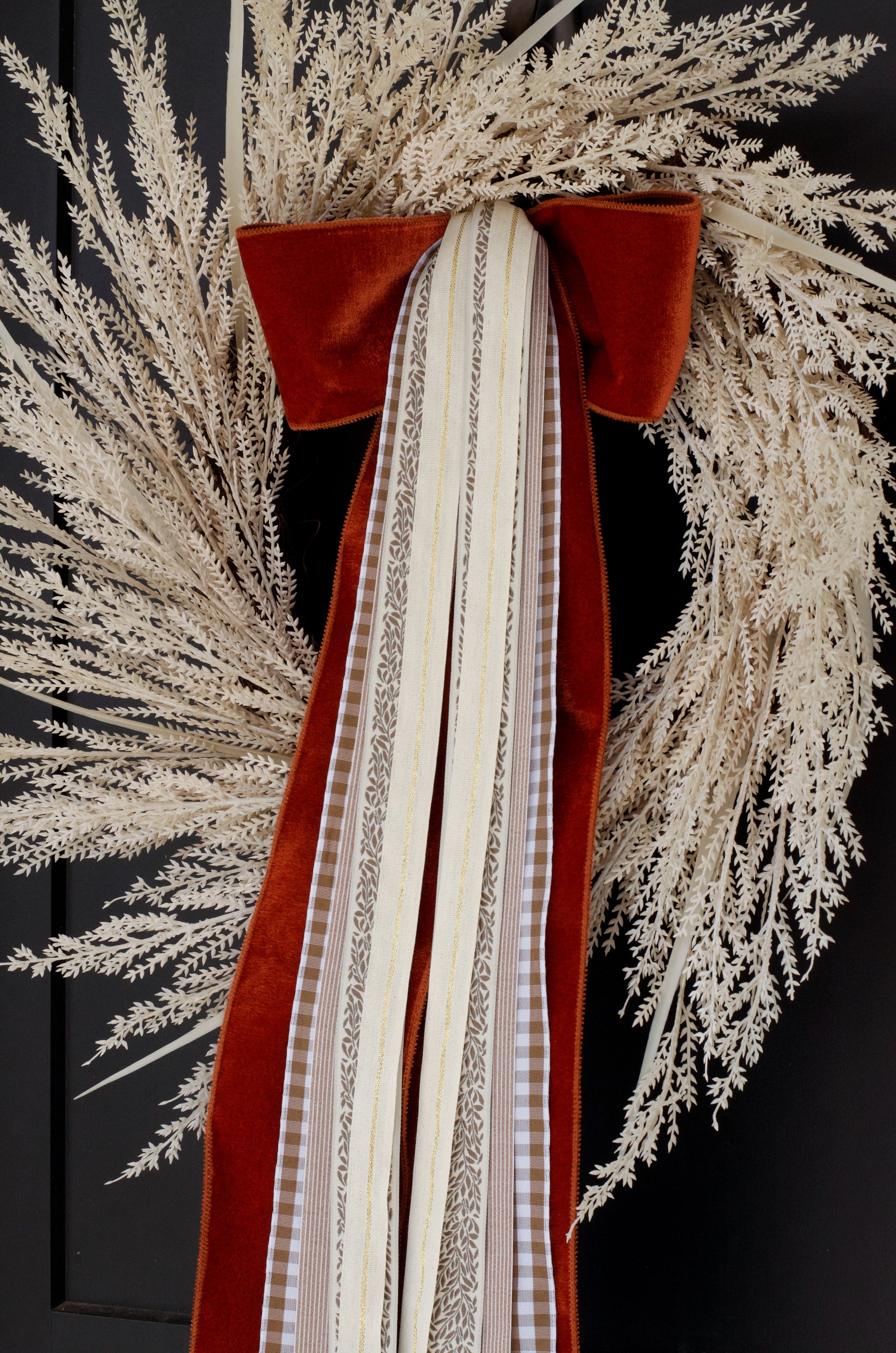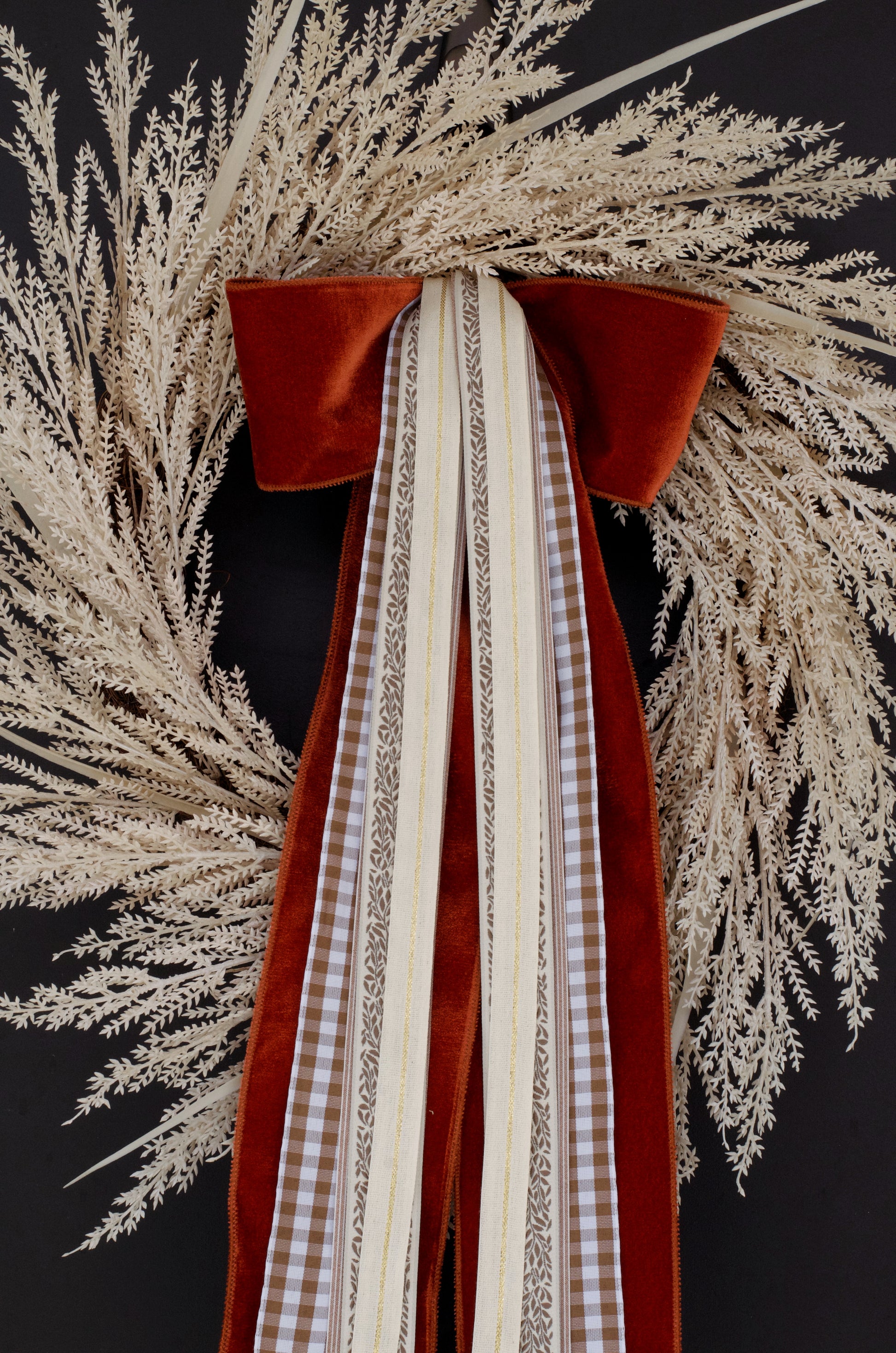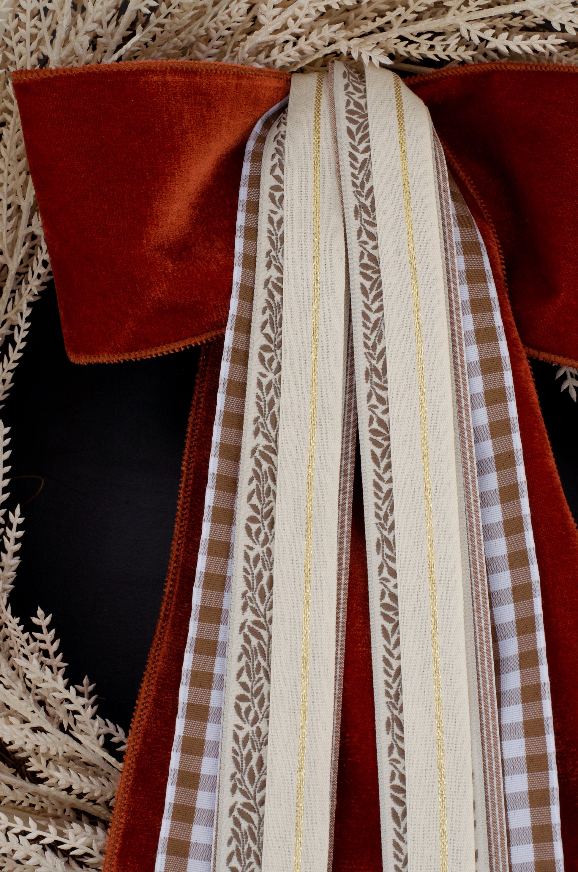 Tied by hand, this one of a kind bow is the perfect addition to your favorite seasonal wreath. Let's celebrate fall with this luxe autumn-inspired bow with premium velvet, gingham, and stripe ribbons. Pairs beautifully with any fall or everyday wreath. Clip Included.