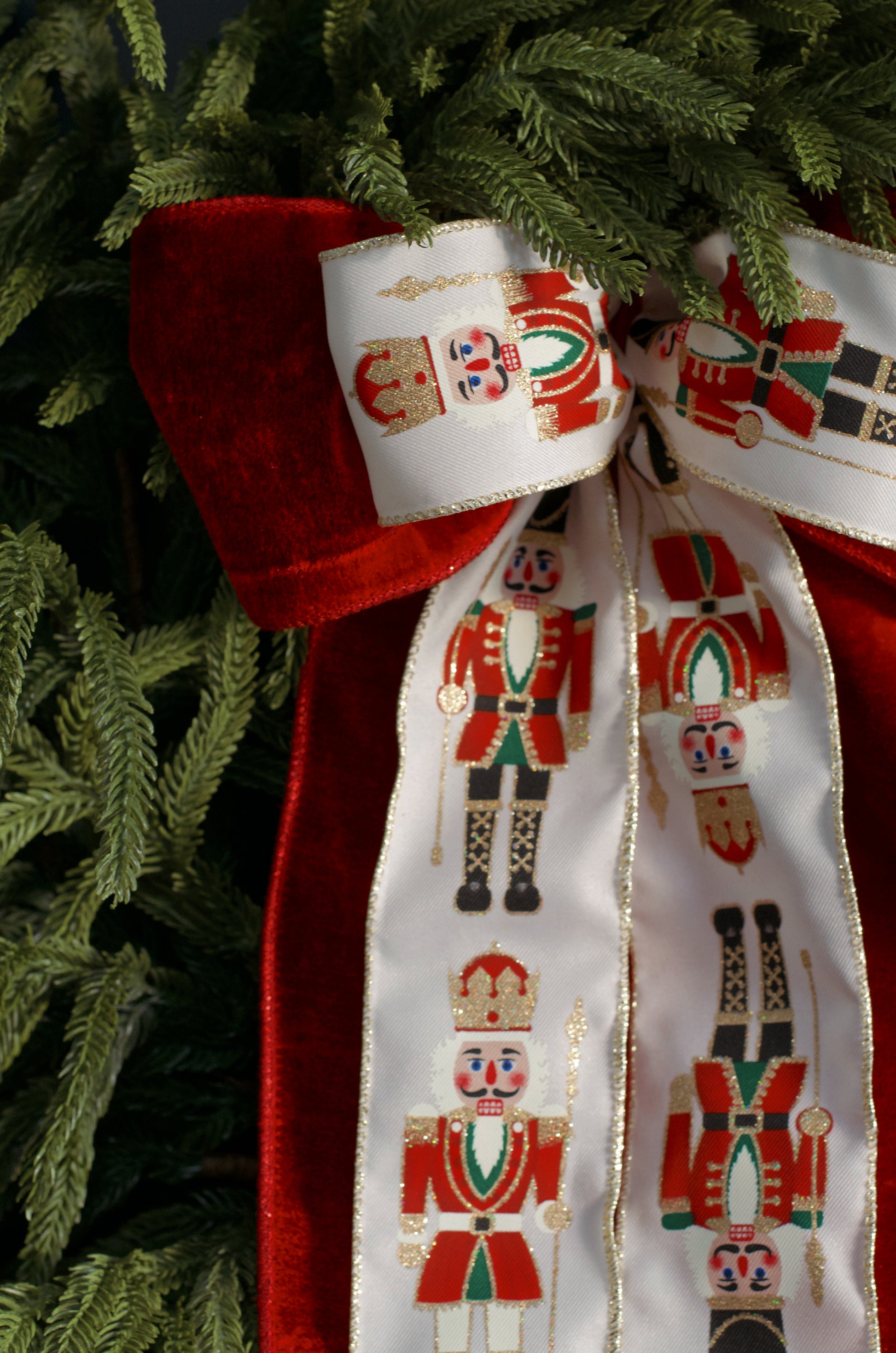 Add a touch of timeless Christmas magic to your front door with our Nutcracker Bow. Tied by hand, this one of a kind bow is the perfect addition to your favorite seasonal wreath. Crafted in rich red velvet & Nutcracker print, its designed to clip easily onto your wreath, adorn your Christmas tree, or dress up your holiday garlands. Its classic holiday palette evokes timeless charm while adding a pop of cheerful color. Clip Included.