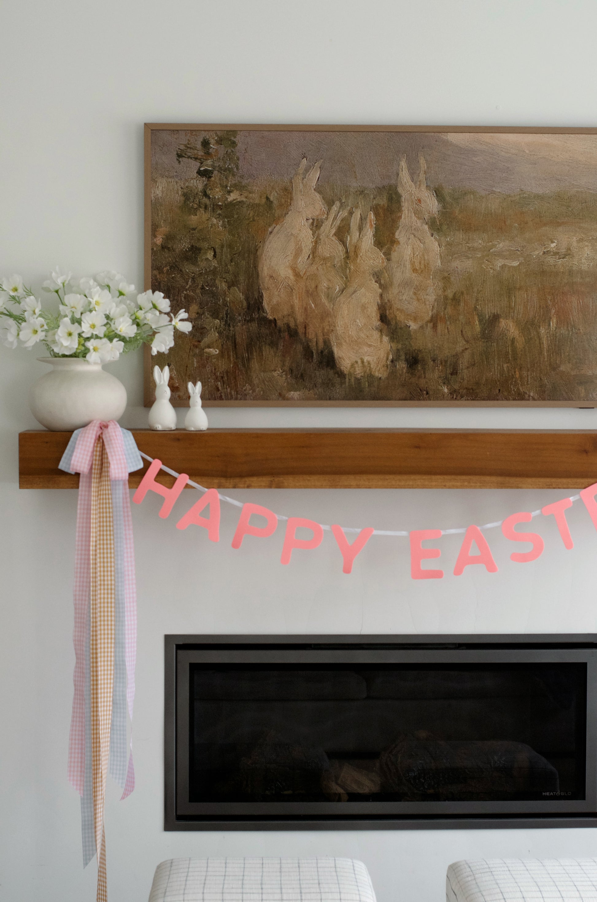 Celebrate the season with this cheerful Pink Happy Easter die-cut felt banner. Perfect for adding a festive flair to your easter mantel and gatherings. This charming garland features felt die cut letters attached to a white ribbon that brings springtime joy to any space. Gingham ribbons sold separately.