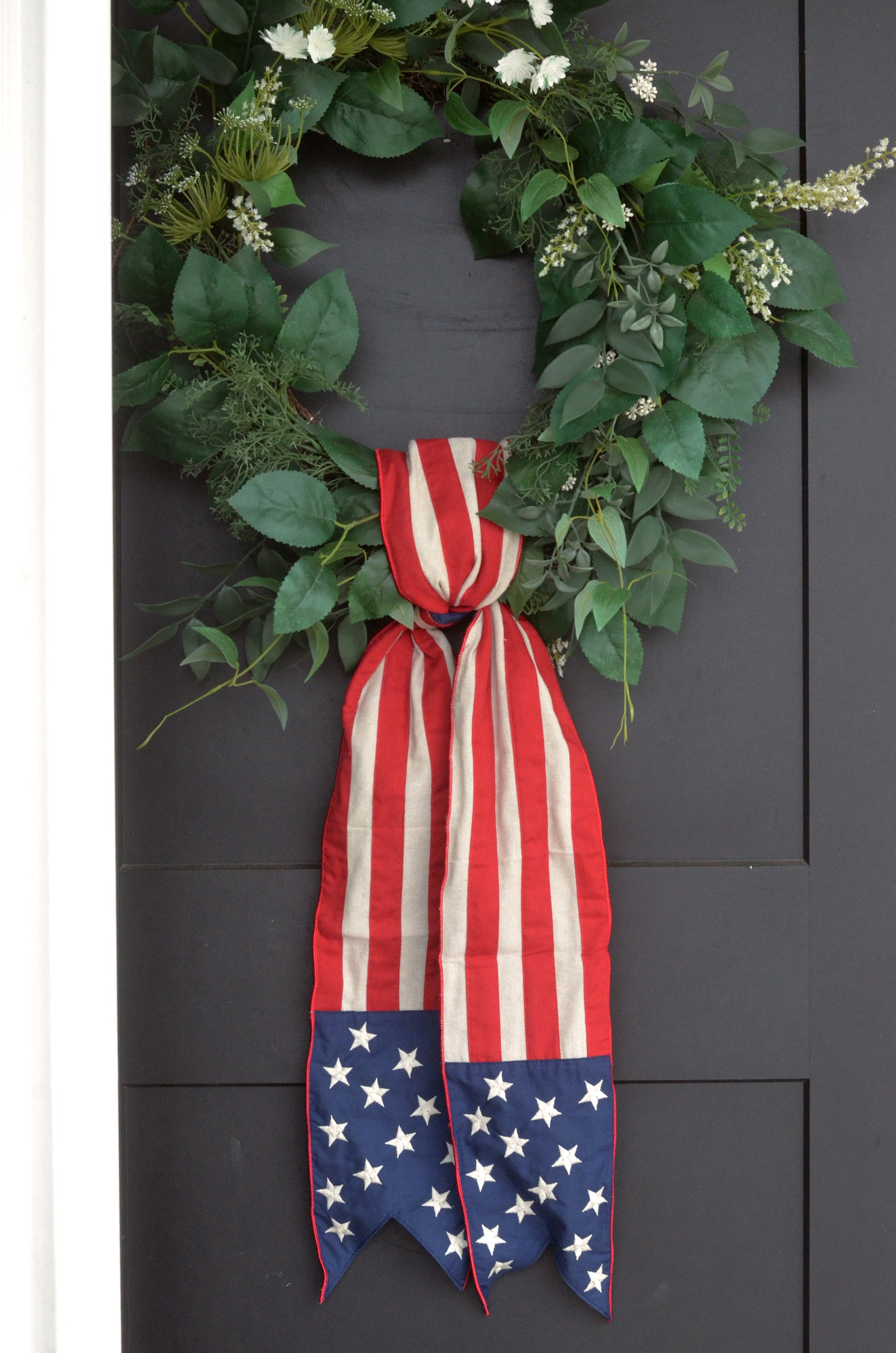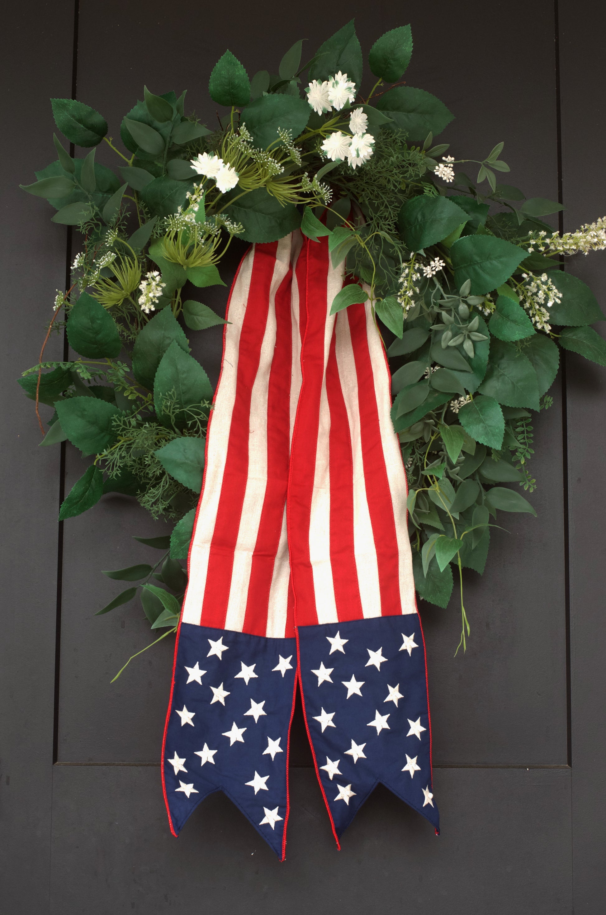This patriotic wreath sash creates that effortless, collected over time look, perfect for memorial day, fourth of july, labor day, and all american summer decorating. Crafted with a soft, lightly structured fabric, wired edges and finished ends it hangs beautifully with a relaxed, heirloom feel, making it an easy way to give your greenery that "main character" moment without overthinking it.