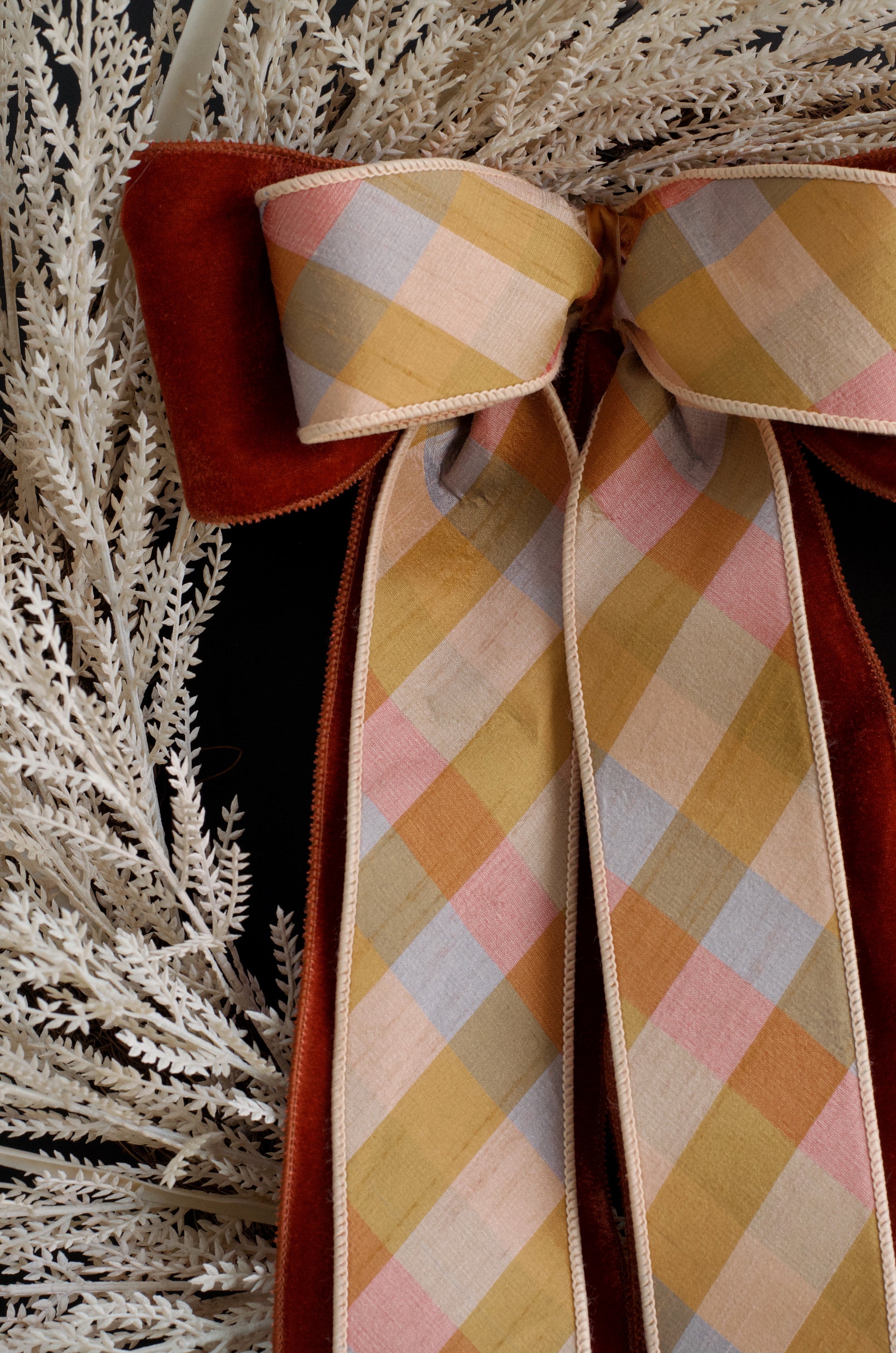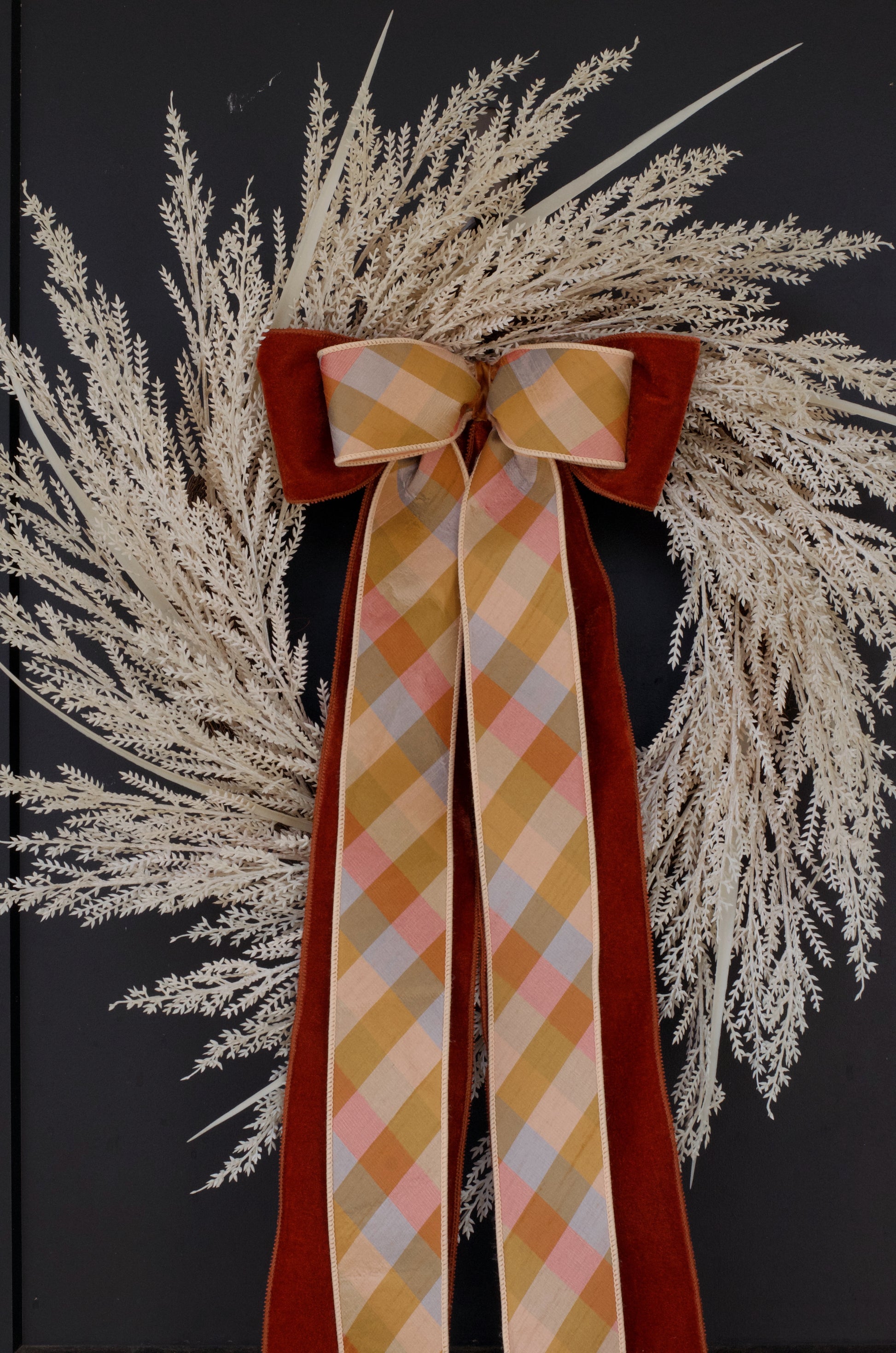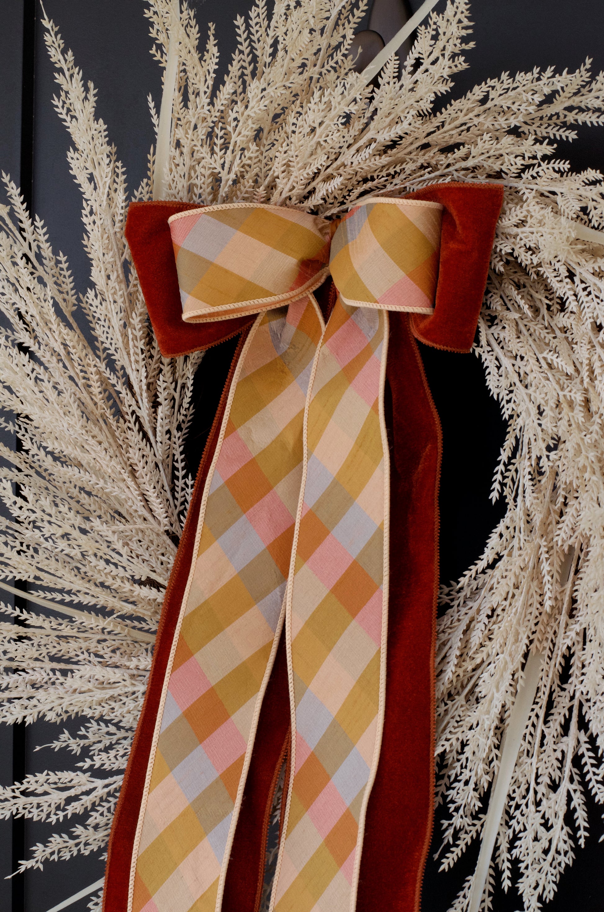 Tied by hand, this one of a kind bow is the perfect addition to your favorite seasonal wreath. Let's celebrate fall with this luxe autumn-inspired bow with premium velvet and plaid ribbon. Pairs beautifully with any fall or everyday wreath. Clip Included.