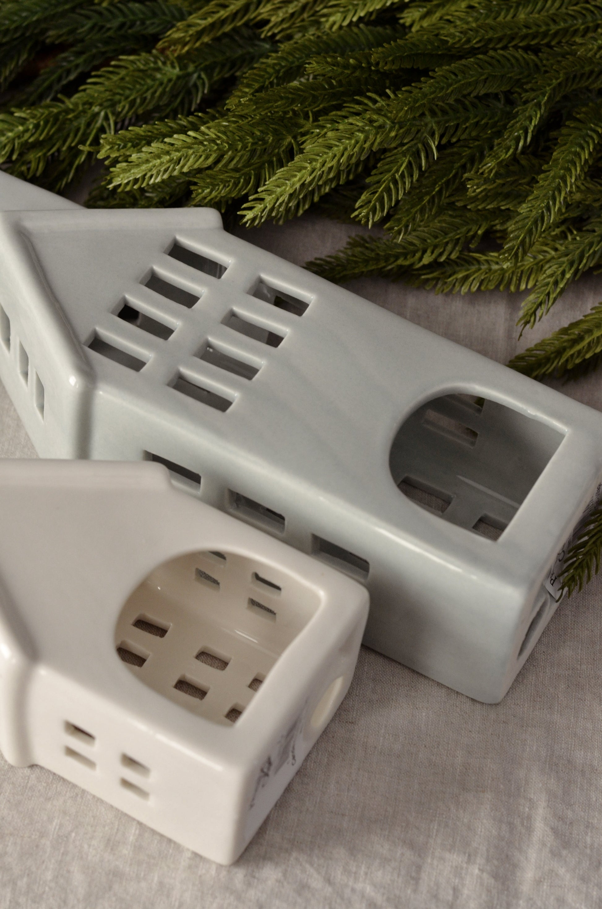 Welcome cozy season with our Winter Village Candle Holder Set. These sculpted village houses feature a cream and muted blue glaze finish and space inside each holder for a single candle that illuminates the cutout designs throughout. Our Winter Village Candle holder set fits standard tealight candles and can free-stand on flat surface. Candles pictured not included. A rustic set of seasonal home accents perfect for adding natural lighting to any living space.